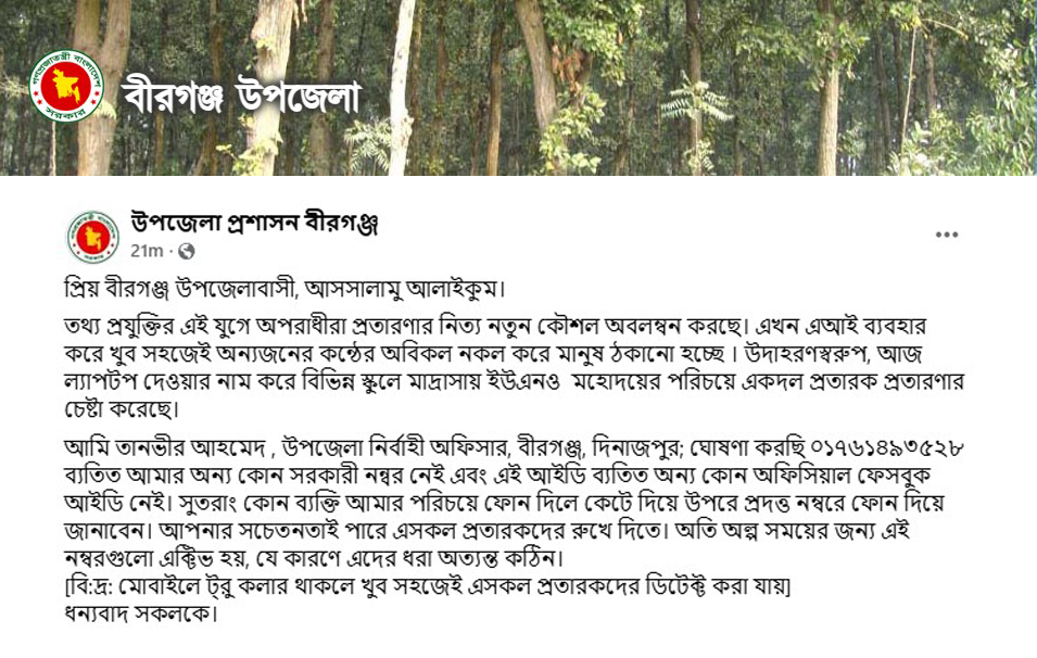 উপজেলা নির্বাহী কর্মকর্তার নির্ধারিত সরকারি মোবাইল নাম্বার ও একটি ফেইসবুক আইডি ছাড়া অন্য কোন নাম্বার বা পেইজ নেই। তাই এসব নির্ধারিত নাম্বার ও আইডি ছাড়া ভিন্ন কোন নাম্বার থেকে কল,আইডি থেকে মেসেজ গেলে বিভ্রান্ত না হওয়ার আহবান জানিয়ে সেই পোস্টে তিনি বলেন,’আমি তানভীর আহমেদ , উপজেলা নির্বাহী অফিসার, বীরগঞ্জ, দিনাজপুর; ঘোষণা করছি ০১৭৬১৪৯৩৫২৮ ব্যতিত আমার অন্য কোন সরকারী নন্বর নেই এবং এই আইডি ব্যতিত অন্য কোন অফিসিয়াল ফেসবুক আইডি নেই। সুতরাং কোন ব্যক্তি আমার পরিচয়ে ফোন দিলে কেটে দিয়ে উপরে প্রদত্ত নম্বরে ফোন দিয়ে জানাবেন। আপনার সচেতনতাই পারে এসকল প্রতারকদের রুখে দিতে। অতি অল্প সময়ের জন্য এই নম্বরগুলো এক্টিভ হয়, যে কারণে এদের ধরা অত্যন্ত কঠিন।’