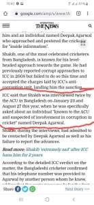 সাকিব আল হাসান ২০০৮ সালে “জুয়াড়ির ম্যাচ ফিক্সিং এর প্রস্তাব” আইসিসিকে জানালেও ২০১৭ সালের পর ভারতের অন্যতম বড় জুয়াড়ি ‘দিপক আগারওয়াল’ অথবা অন্য কোন জুয়াড়ির থেকে যে প্রস্তাব পান তা আইসিসি বা আকসু অথবা অন্য কোন সংশ্লিষ্ট প্রতিষ্ঠানকে জানাতে ব্যর্থ হন।