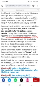 “ইন্ডিয়া-টুডে” তে প্রকাশিত এক প্রতিবেদনে বলা হচ্ছে যে,সাকিব আল হাসান ‘দিপক আগারওয়াল’ এর সাথে আগে দেখা করতে চেয়েছেন। তারপর সোশ্যাল মিডিয়া থেকে সাকিব ও আগারওয়ালের বেশ কিছু কথপোকথন মুছেও ফেলেছেন সাকিব। যা তিনি পরবর্তীতে স্বীকার করেছেন। দীর্ঘদিনের এতো যোগাযোগের পড়েও তিনি তা আইসিসিকে জানান নি।