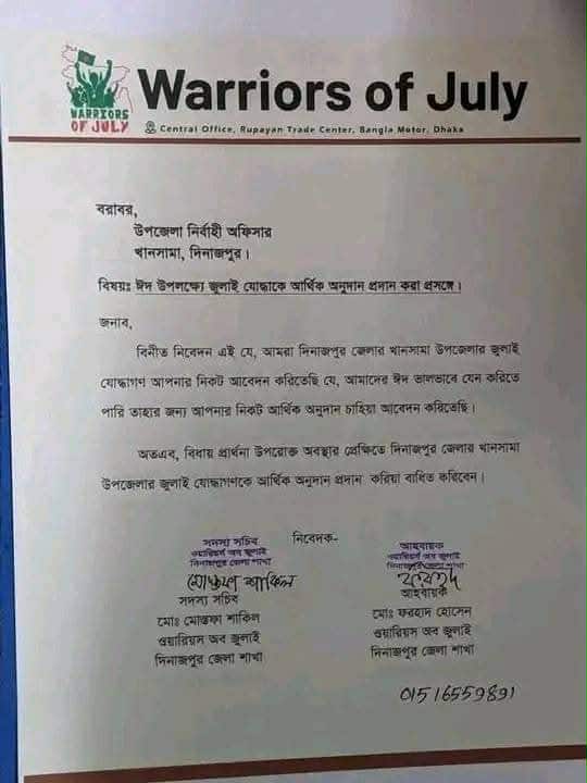 ভাইরাল ‘জুলাই যোদ্ধা’র অনুদান চিঠি নিয়ে যা জানা গেল • এ ব্যাপারে জানে না সংগঠনটির কেন্দ্রীয় নেতারা • বৈষম্য বিরোধী নেতারা বলছেন এরা...